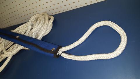 In the Velcro style we use a 1" bias binding 3 of the 4 edges, Velcro along the full length and 2-3 mm ties (Black or Navy standard, White available as option) that allow you to tie to the eye and cinch the other end to prevent movement up and down the dock line. If positioned away from the eye, you can use these 12" ties to pass into the 3-strand or braid and secure the chafe guard anywhere.